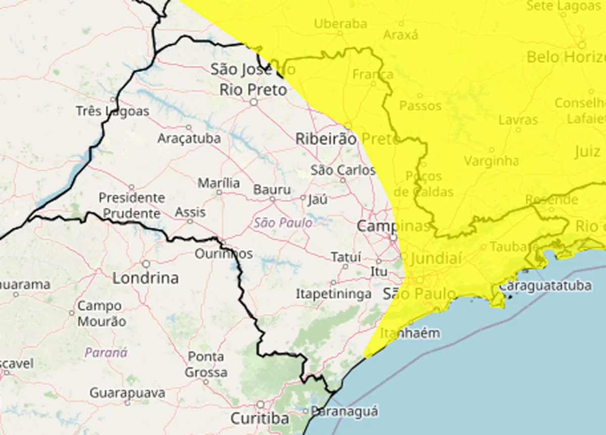 De acordo com o alerta, as regiões leste, norte e sul do estado estão sob risco, classificado como ‘perigo potencial’, segundo a escala do Inmet que possui três níveis de severidade. A Climatempo acrescenta que a combinação de altas temperaturas e umidade elevada tem favorecido a formação de chuvas fortes.