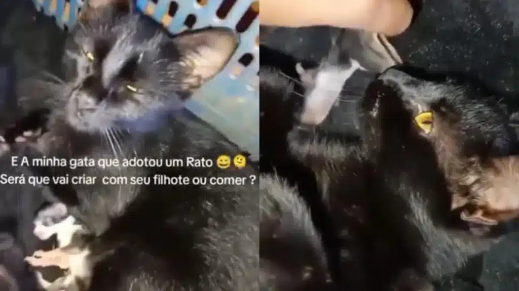 Ingrid contou que no dia seguinte ao nascimento de seus filhotes, decidiu checar como estavam todos. Para sua surpresa, encontrou um pequeno rato junto de sua gata, chamada Pantera. “Eu ia tirá-lo, mas percebi que ela realmente o havia adotado”, relatou a tutora, visivelmente emocionada com a cena.
